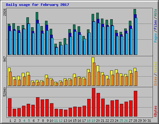 | Day | Hits | Files | Pages | Visits | Sites | KBytes | ||||||